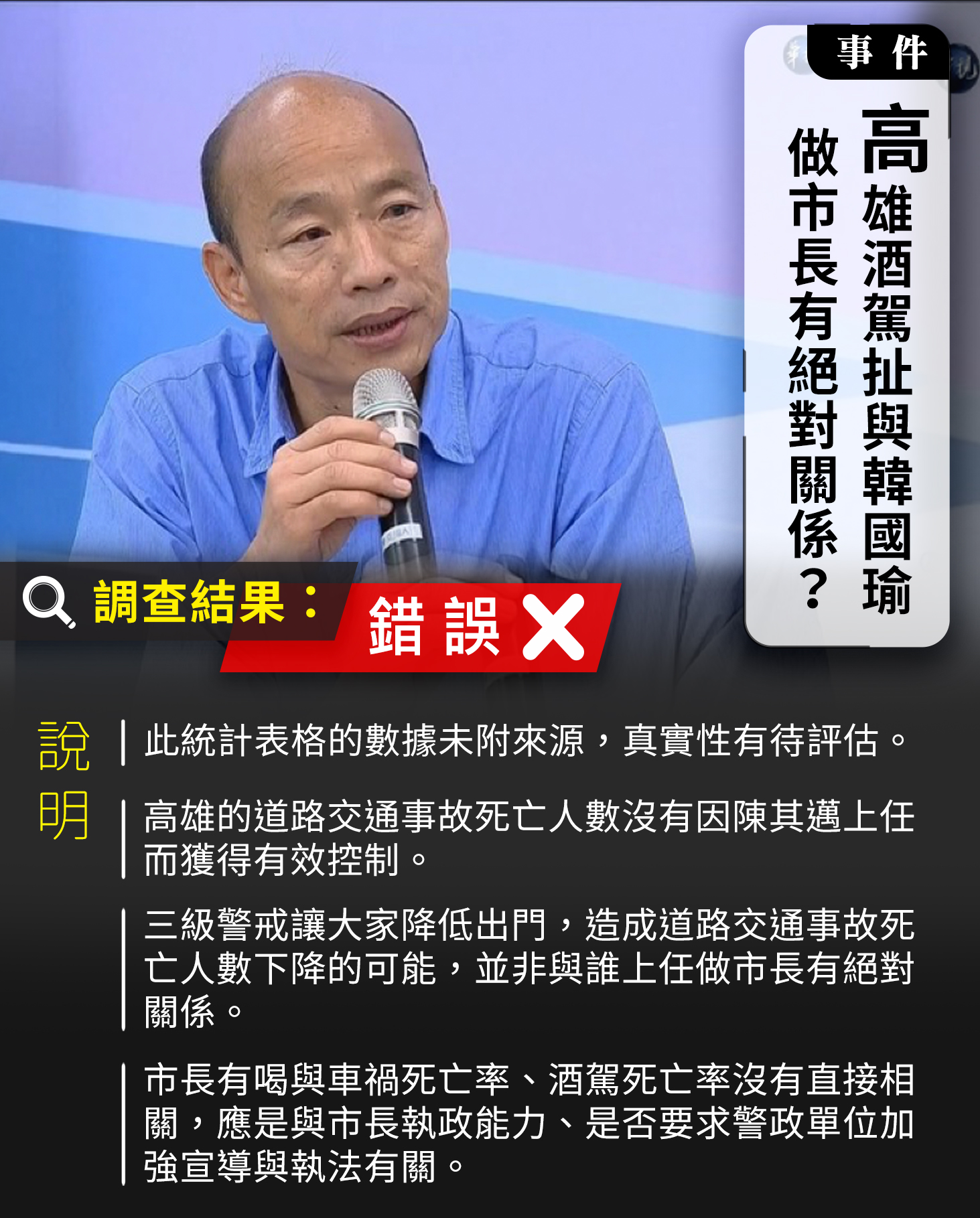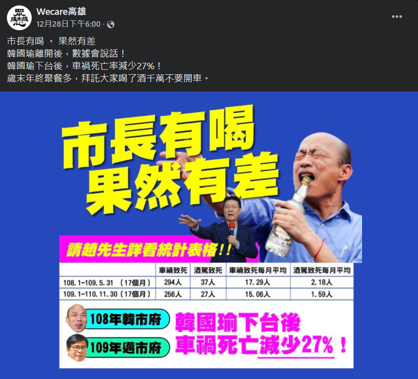 爭議內容:市長有喝。果然有差。韓國瑜離開後,數據會說話!韓國瑜下台後,車禍死亡率減少27%!