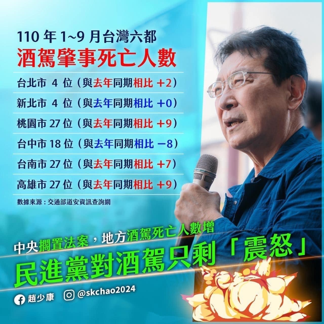 若以韓國瑜108年,陳其邁109年的邏輯分類,108年的因酒駕案件致死數45確實較109年的25高,趙少康指出在110年1~9月台灣六都酒駕肇事死亡人數,可以發現高雄市有27人,與去年同期(109年1~9月)相比+9,也經道安資訊查詢網確認數據正確,突顯高雄酒駕致死人數,在陳其邁主政下,還是攀升的。