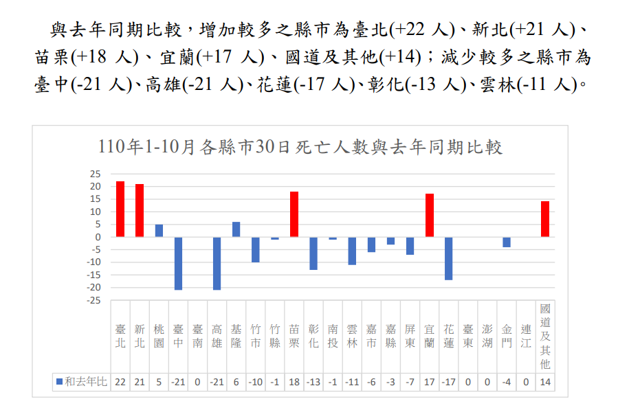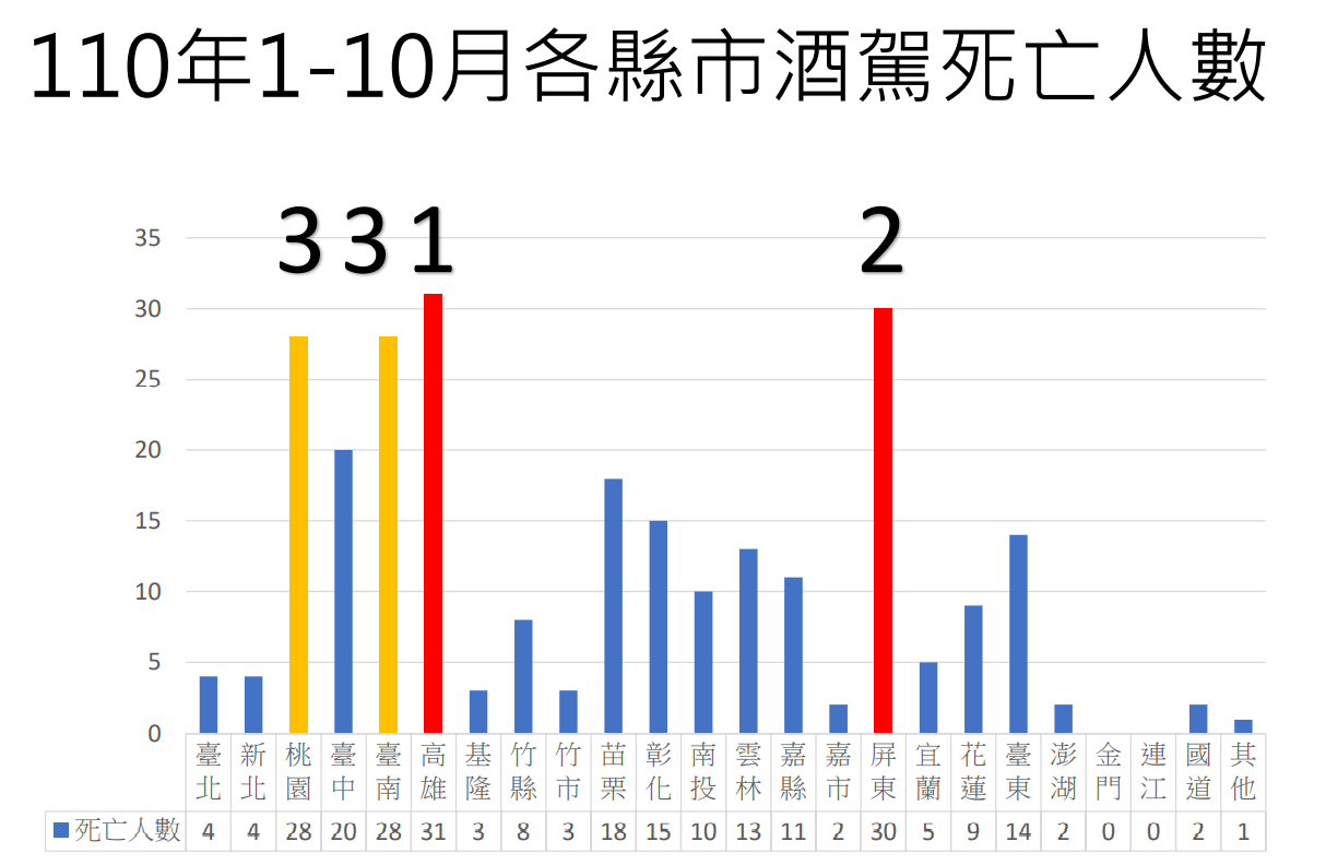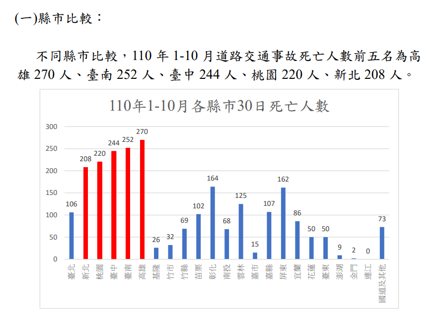 事實:根據中華民國交通部網站之交通新聞稿資料,查找110年1-10月道路交通事故統計分析之相關附件,得知110 年 1-10 月道路交通事故死亡人數前五名為高雄 270 人、臺南 252 人、臺中 244 人、桃園 220 人、新北 208 人(附圖5)。雖與去年同期比較,高雄有減少(-21人),不過以酒駕死亡人數來看,高雄還是最高。