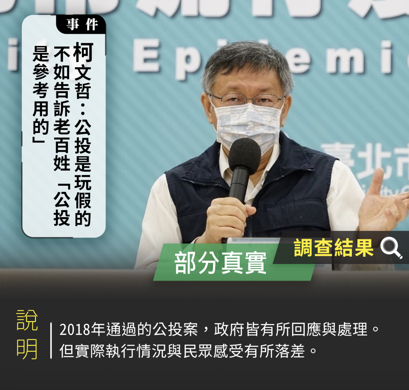 實際執行上,依照各公投案主文內容,相關施行細則或法律條文亦有所修正。如前所述,公投通過後,電業法確實刪除第95條第一項,但實際上核電廠除役計畫並無更改,政府亦沒有更多「以核養綠」的進一步動作;同理,同志教育亦僅在施行細則上調整用字,並未有任何實質改變的動作。因此,柯文哲的說法與事實有所出入,但就人民感受部分則有部分真實。
