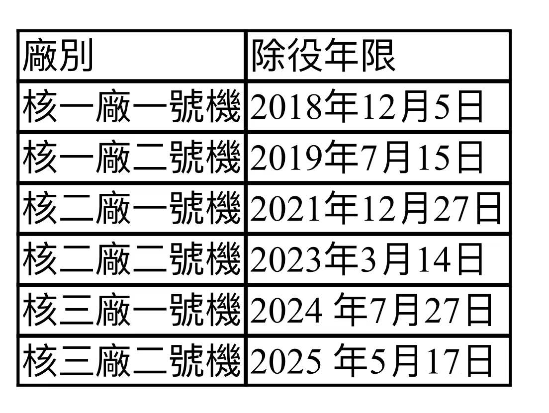目前各核電廠實際運轉情況,根據行政院原子能委員會所公告之除役計畫,除核一廠一號機與二號機已於2019年7月15日全數停止運轉外,核二廠也將於2023年全數除役。而規劃最後除役核三廠二號機,仍預定於2025 年5月17日停止運轉。由實際除役規劃中可看出,雖公投刪除電業法中對於核能發電設備的限制,但除役規劃卻未隨之調整,國內所有核能發電設備仍將在民國114年全數除役。核能廠發電機組除役時間請見下表: