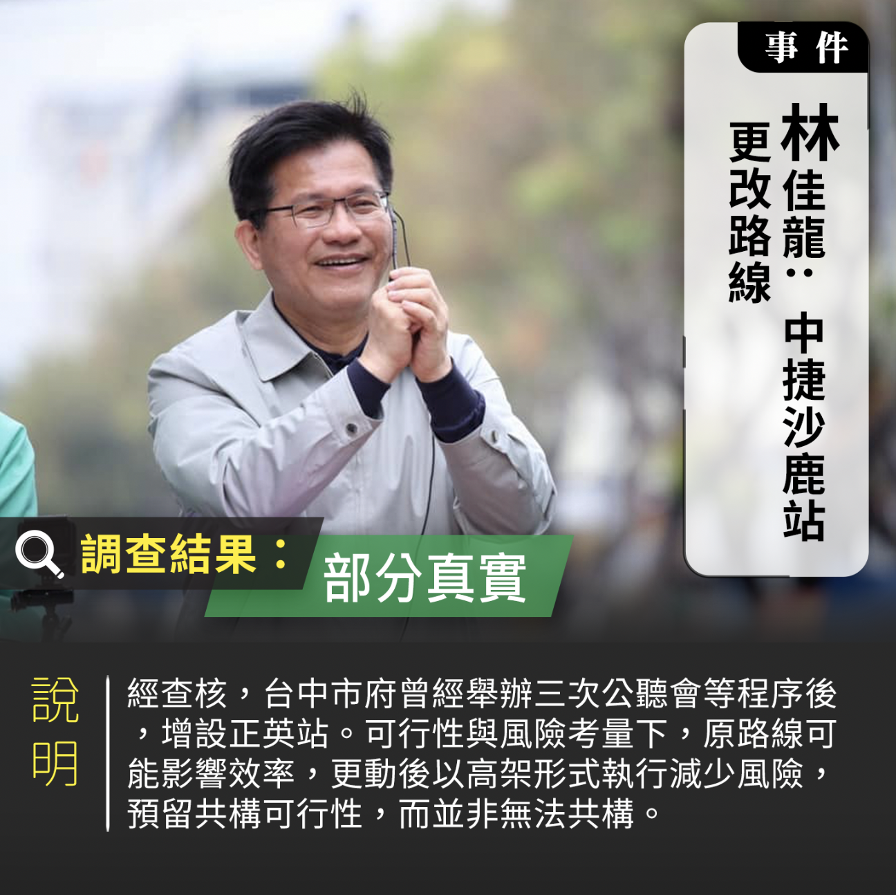林佳龍受訪時說,過去擔任台中市長時捷運藍線可行性研究經過行政院核定,也是前瞻基礎建設的特別預算支持,具環評和地方公聽會的程序,盧市府變更未經過相同程序,在顏家的影響下坪頂站因此消失,變更程序及內容上具爭議。他說,沙鹿本身另外有4站,除了B8正英站,B4及B5在沙鹿火車站附近也更改路線,已經影響捷運藍線及鐵路高架化的共站。