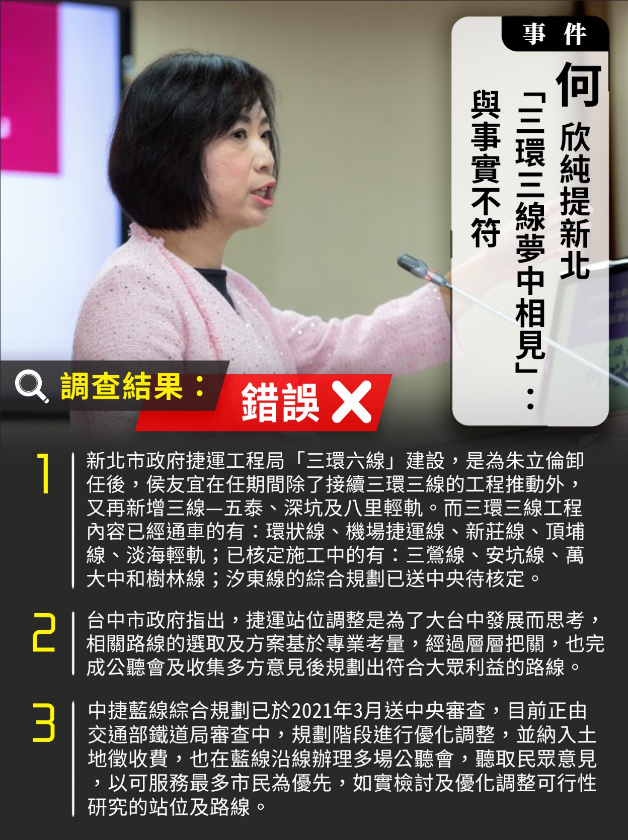 事實:新北市議員葉元之在1月26日臉書發文表示,三環三線是由9條捷運組成,已經通車的有:環狀線、機場捷運線、新莊線、頂埔線、淡海輕軌,已核定施工中的有:三鶯線、安坑線、萬大中和樹林線。另外還有汐東線的綜合規劃已送中央待核定,所謂的「三環三線夢中實現」,是好幾年前民進黨網軍用來抹黑新北市的話術,新北市府早已多次澄清,也以行動粉碎謠言,沒想到多年後,被民進黨大立委引用來攻擊盧秀燕。