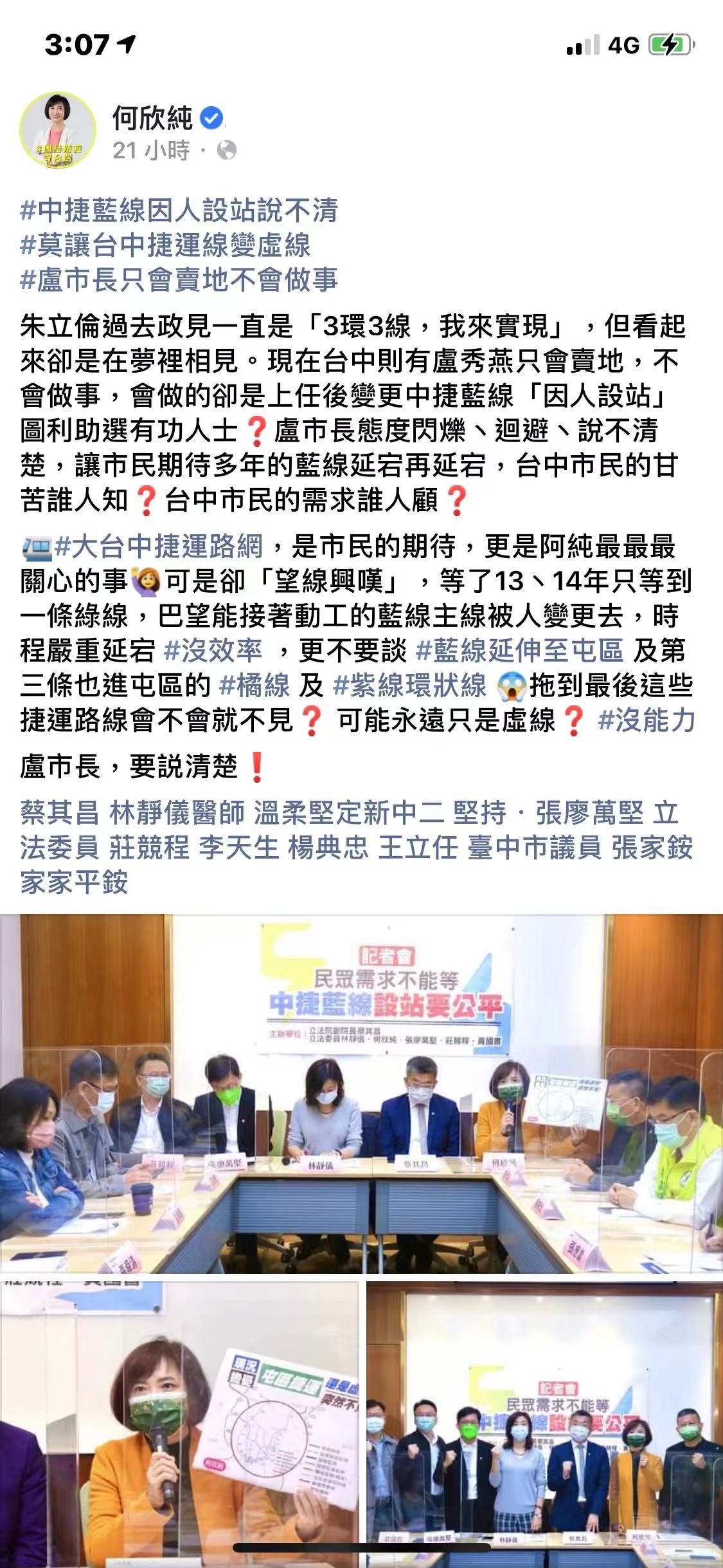 爭議內容:何欣純發文表示,朱立倫過去政見一直是「3環3線,我來實現」,但看起來卻是在夢裡相見。現在台中則有盧秀燕只會賣地,不會做事,會做的卻是上任後變更中捷藍線「因人設站」圖利助選有功人士?盧市長態度閃爍丶迴避丶說不清楚,讓市民期待多年的藍線延宕再延宕。