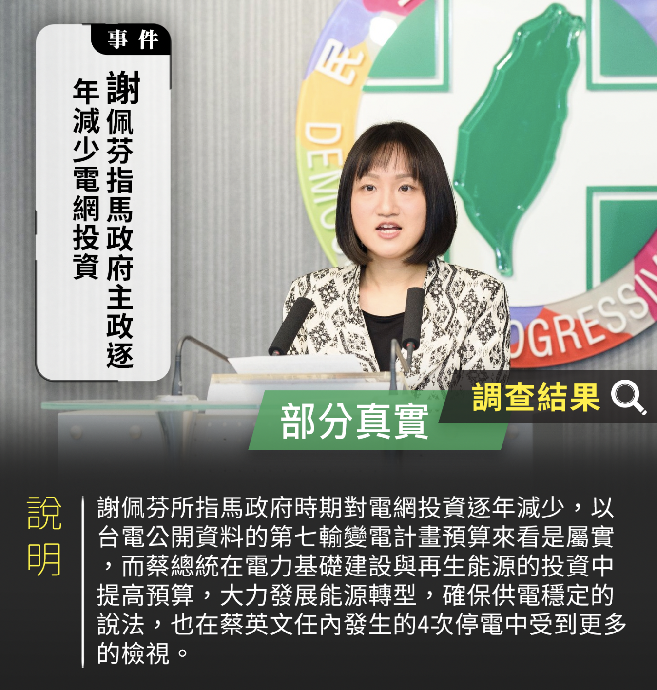 謝佩芬所指馬政府時期對電網投資逐年減少,以台電公開資料的第七輸變電計畫預算來看是屬實,而蔡總統在電力基礎建設與再生能源的投資中提高預算,大力發展能源轉型,確保供電穩定的說法,也在蔡英文任內發生的4次停電中受到更多的檢視。