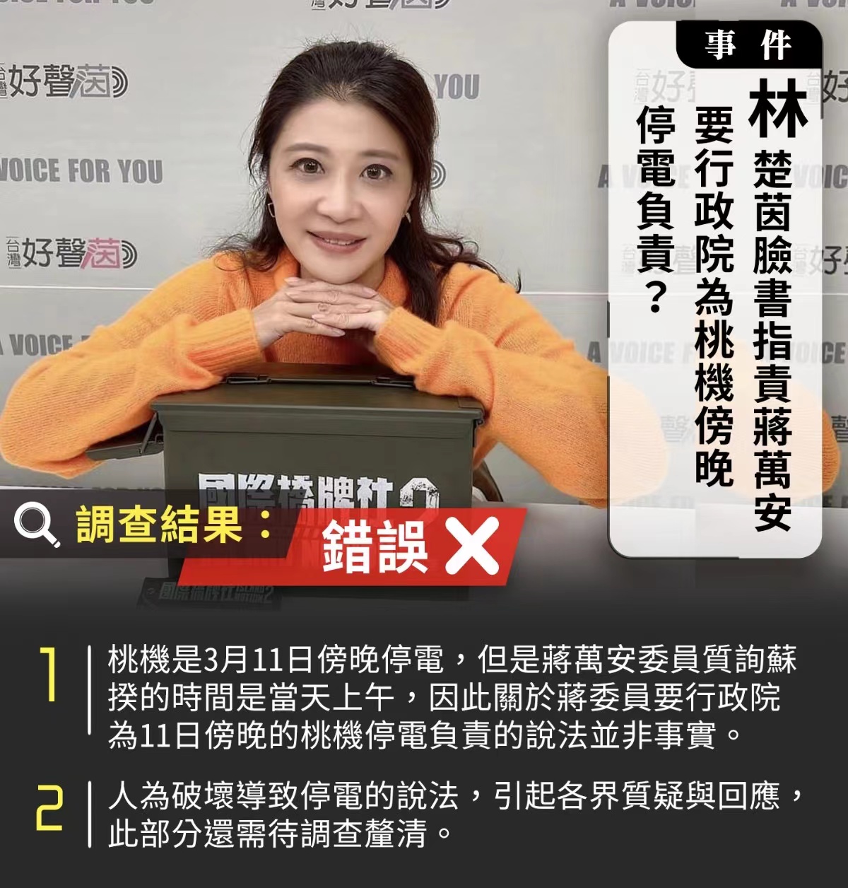 爭議內容:立法委員林楚茵3月15日於臉書貼文表示,蔣萬安委員為了選舉提高聲量,不分青紅皂白地要行政院為11日傍晚的桃機停電負責。經調查結果,是因為「兩位工人偷電纜變賣才將電纜剪斷」才造成停電,並要求蔣萬安委員為罵錯人道歉。