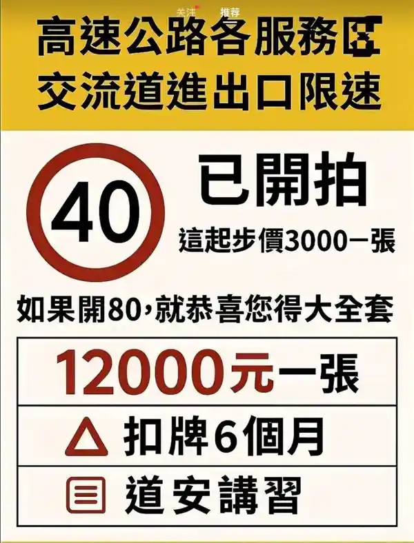 近期社群平台與即時通訊軟體瘋傳一張圖卡,內容宣稱:「高速公路各服務區進出口限速 40,開始測速照相,起步價 3000 元,若開 80 公里可罰 12000 元並扣牌6個月、道安講習」,並強調「全省的休息站都有設」,引發不少駕駛人憂慮。