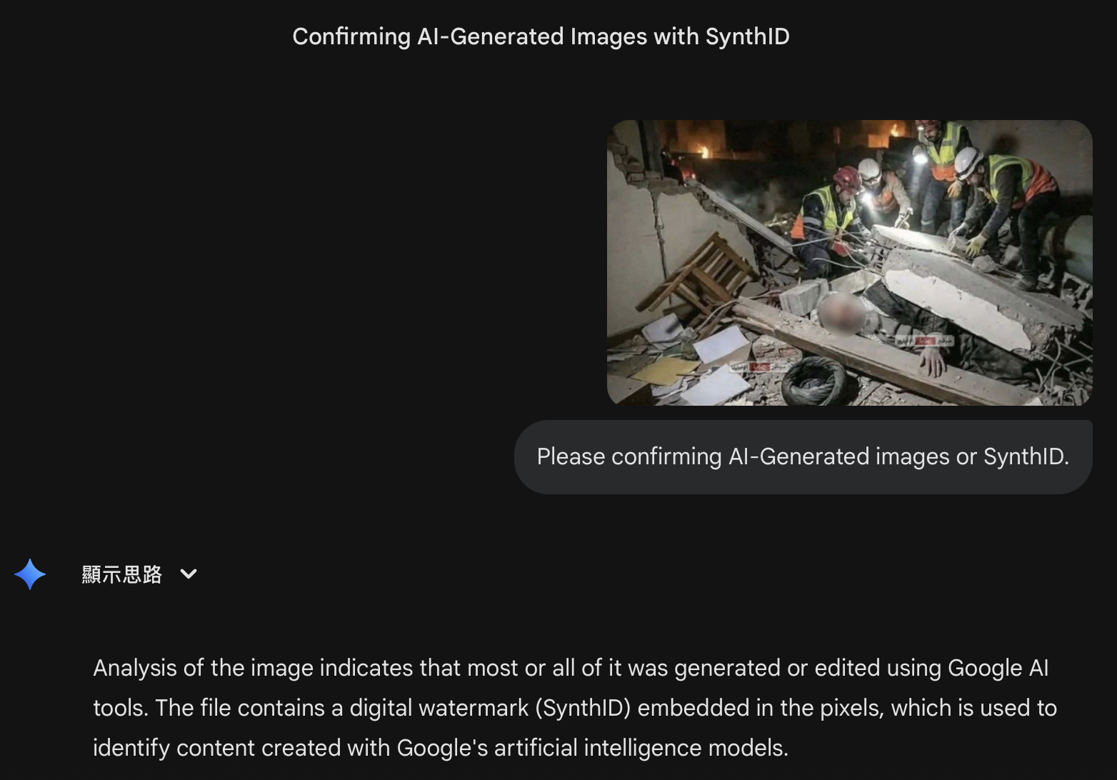 該圖經 AI 檢測工具辨識後,確定該圖是由 Gemini 生成,且含有 SynthID 浮水印(對話存檔)。該項技術由 Google DeepMind 開發,透過在 AI 生成的內容中嵌入肉眼無法察覺的數位浮水印,來協助識別 AI 創作的影像、音訊或文字。