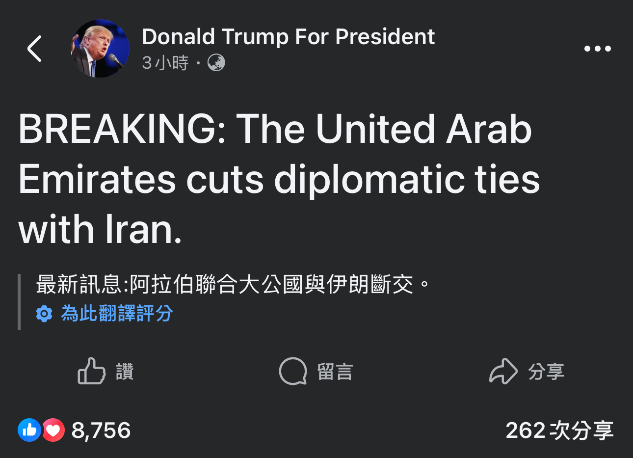 Threads 上網友自稱「最新訊息」,指出阿拉伯聯合大公國與伊朗宣布斷交。然而,查核記者檢索相關資料發現,阿聯雖然關閉使館、撤回大使,但截稿前並未有兩國宣布斷交的消息。