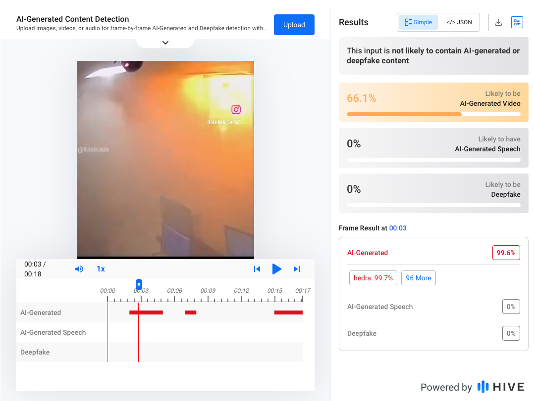▲ 經過 AI 工具檢測,最有可能的是利用既有的影片畫面,增加爆炸效果。時間軸顯示,爆炸當下的畫面是由 AI 生成。(圖/翻攝 HIVE AI-Generated Content Detection)