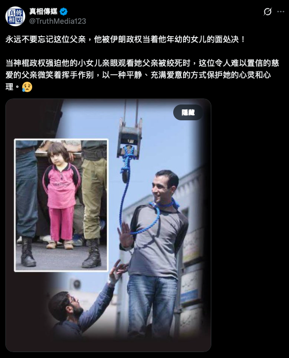 X 社群「真相傳媒」於 3 月 1 日貼出一則圖片,並指出照片中的父親,被「神棍伊朗政權」處以絞刑,甚至讓他的女兒在一旁全程目睹,兩人告別的畫面令人鼻酸;也有部分社群貼文指出,他是因為批評執政當局遭到判刑。