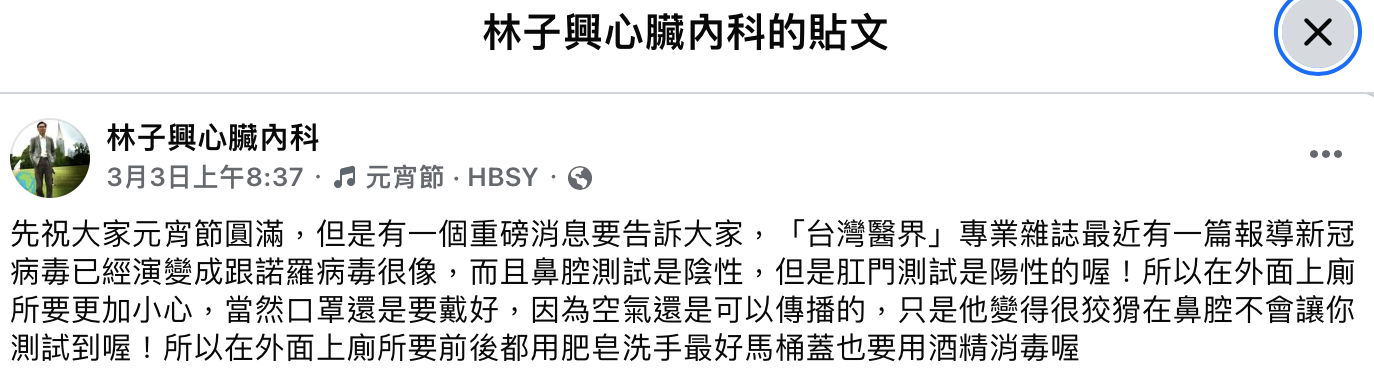網傳訊息指出,最新的「台灣醫界」專業雜誌報導新冠病毒演變成跟諾羅病毒相似,出現鼻腔測試為陰性,肛門測試卻為陽性的情況。該消息指出因空氣能夠傳播病毒,呼籲民眾戴起口罩,在外如廁時使用肥皂洗手、馬桶蓋要用酒精消毒。