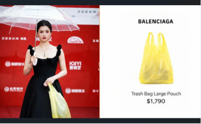 爭議內容:中國女星張婧儀手持黃色塑膠袋出席 2025 年北京國際電影節紅毯,網傳此黃色塑膠袋為 Balenciaga 新款,售價為 1790 美元,引發網路上討論。後續社群媒體也有類似模仿、介紹影片。