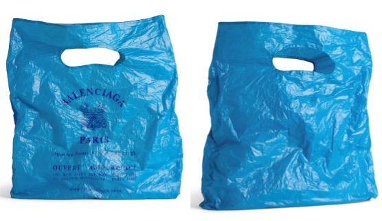 Balenciaga 官網曾上架一款男款托特包名為「 Marché 藍色 Dyneema 中號版型可折疊托特包」,於 Balenciaga 2025 冬季系列 Look 25 中亮相。該托特包外觀仿造可重複使用的超市塑膠袋,連同使用過的折痕細節都保留,售價是 995 美元(約台幣 3.1 萬元 )。材質採用聚酰胺跟迪尼瑪纖維,此面料重量極輕但具有超強拉力,耐磨、防水、抗撕裂,也常用被於防彈衣製作。