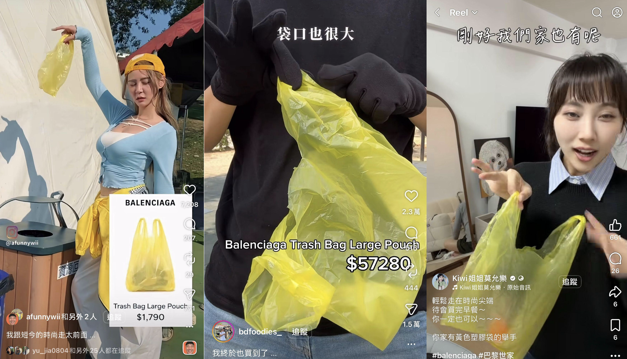 而該品牌也不是第一次設計類似產品,2022 年冬季發表會以「Trash Pouch」命名的新包款登場,官方提及「Trash Pouch」的設計概念取自於垃圾袋,實際材質則是柔軟小牛皮並加入仿造垃圾袋的抽繩設計,透過特殊亮面處理呈現類似塑膠袋的視覺效果;表面印有品牌標誌,並推出黑、黃、藍、白四種配色,這款「垃圾袋」的售價高達 1790 美元(約台幣 5.8 萬元)。品牌設計總監 Demna 也直言:「不能錯過製作世界上最昂貴垃圾袋的機會,因為誰不喜歡時尚醜聞?」
