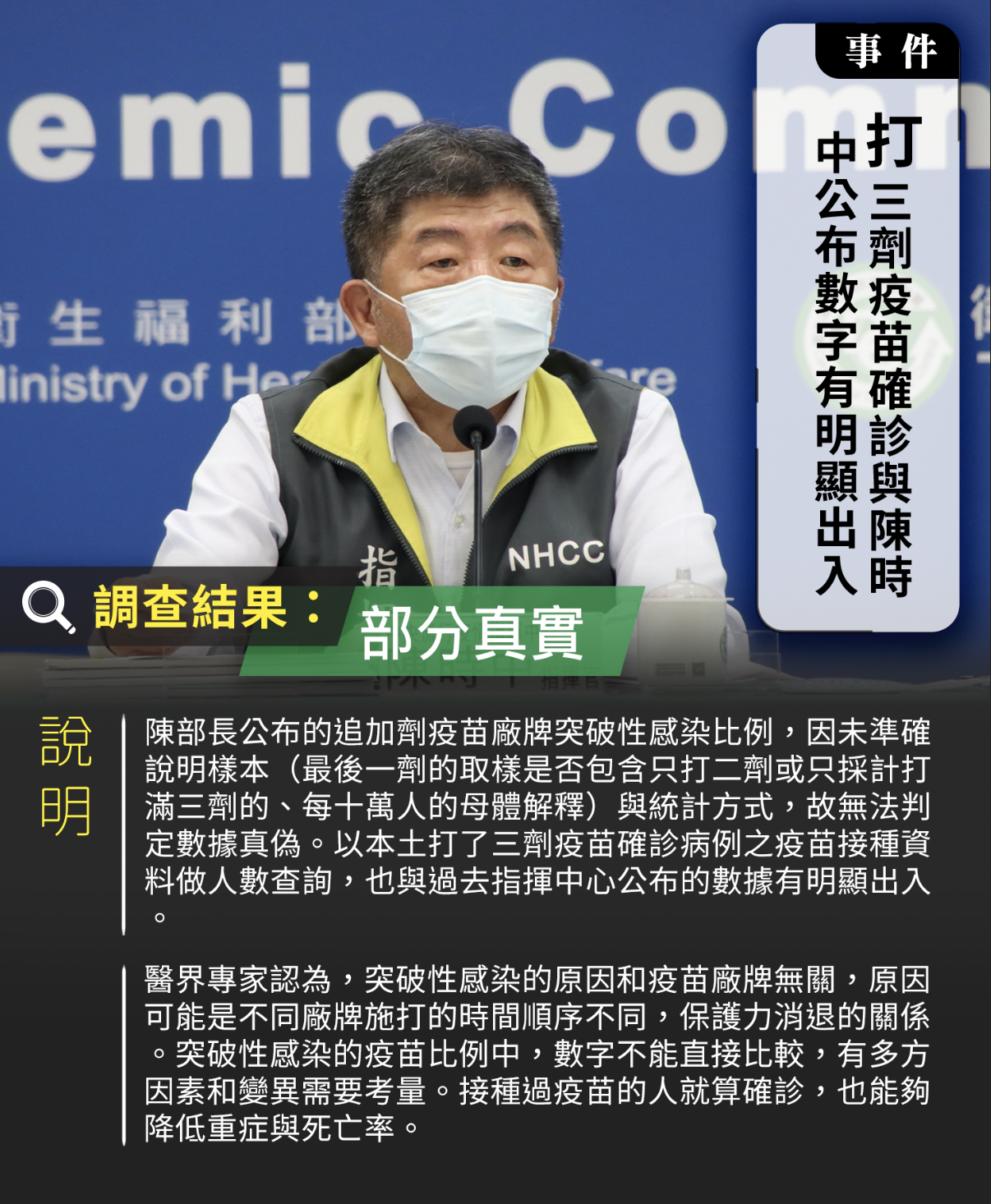 1.陳部長公布的追加劑疫苗廠牌突破性感染比例,因未準確說明樣本(最後一劑的取樣是否包含只打二劑或只採計打滿三劑的、每十萬人的母體解釋)與統計方式,故無法判定數據真偽。以本土打了三劑疫苗確診病例之疫苗接種資料做人數查詢,也與過去指揮中心公布的數據有明顯出入。