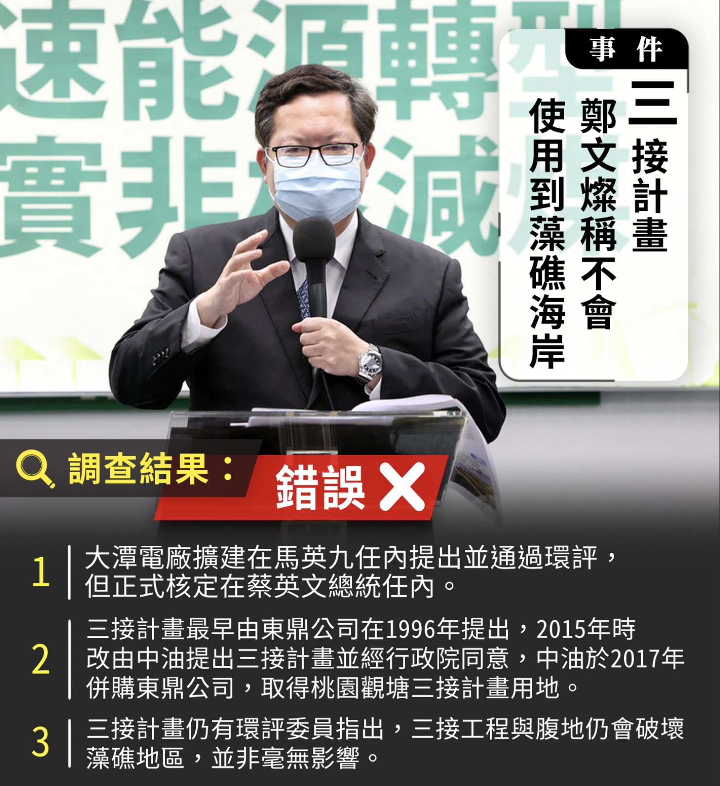 鄭文燦強調,大潭電廠擴建及中油三接計畫是在馬英九任內定案,當時的桃園縣長和6位國民黨立法委員沒有反對,也沒有指定大潭藻礁為保護區。蔡英文總統上任後,希望以最大程度保護藻礁,決定額外花費更大的預算,採取離岸接收,不會使用藻礁海岸(出自聯合新聞網https://udn.com/news/story/122542/5863855)