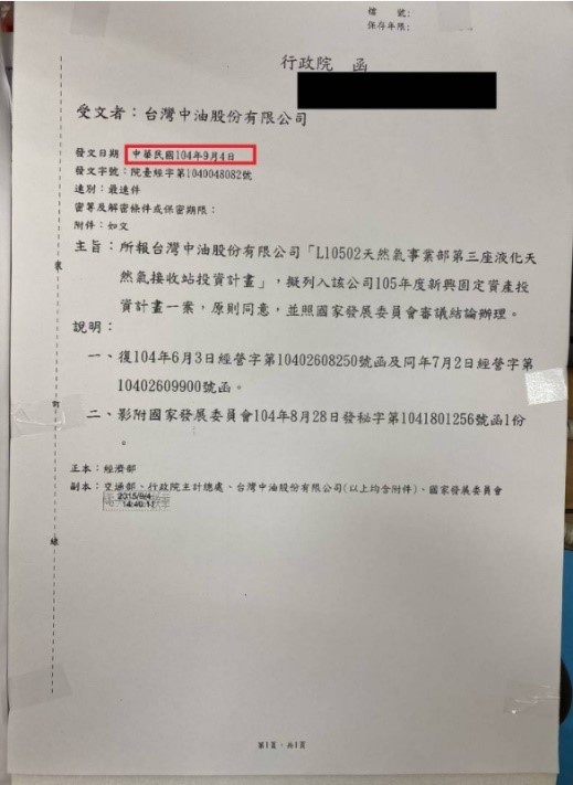 再查詢政府建置之公共政策參與平台,其中〈來監督〉項目中,「大潭電廠增建燃氣複循環機組發電計畫」正式核定通過日期為2016年11月28日,公文字號院臺經字第1050039082號。